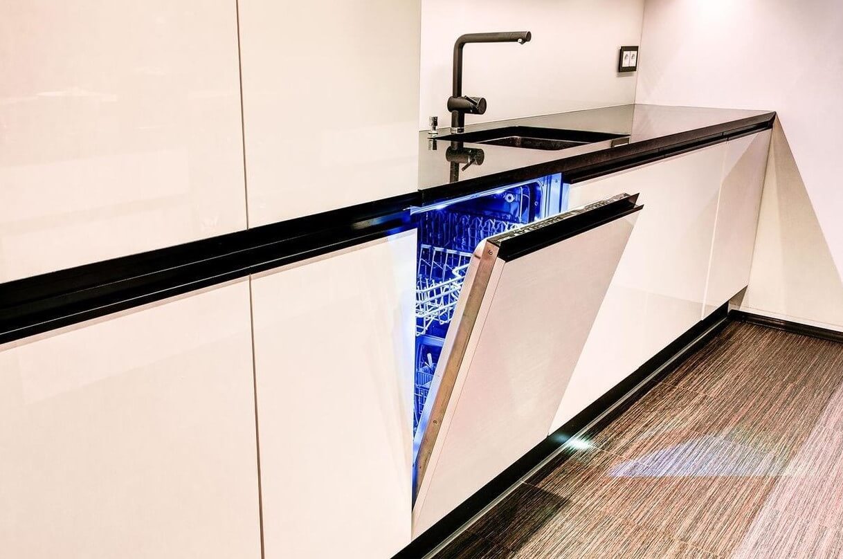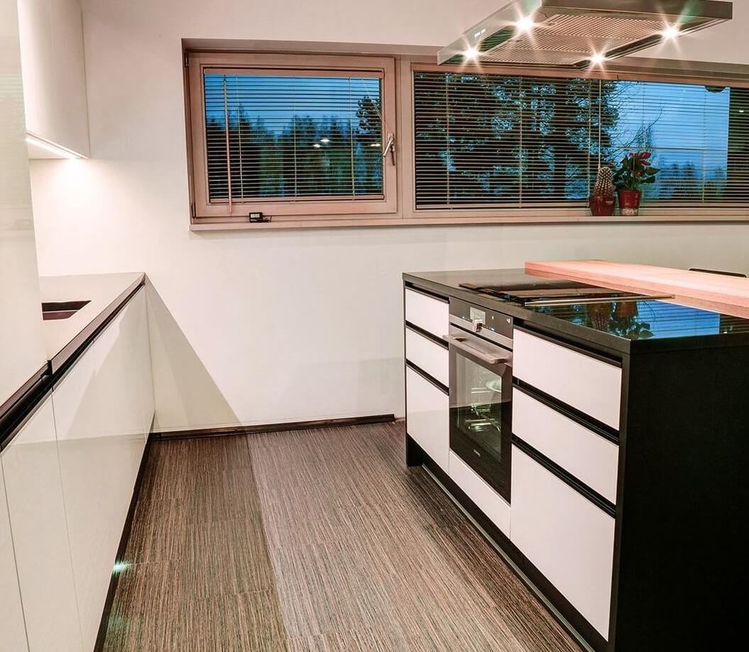 Встроенная современная кухня с островом. Белые глянцевые фасады создают привлекательный блеск, освежают и визуально увеличивают пространство. Черные контрастные вставки придают гарнитуру изюминку, разбавляют однотонность. Кухня отлично будет смотреться в интерьере в стиле минимализм или хай-тек.
