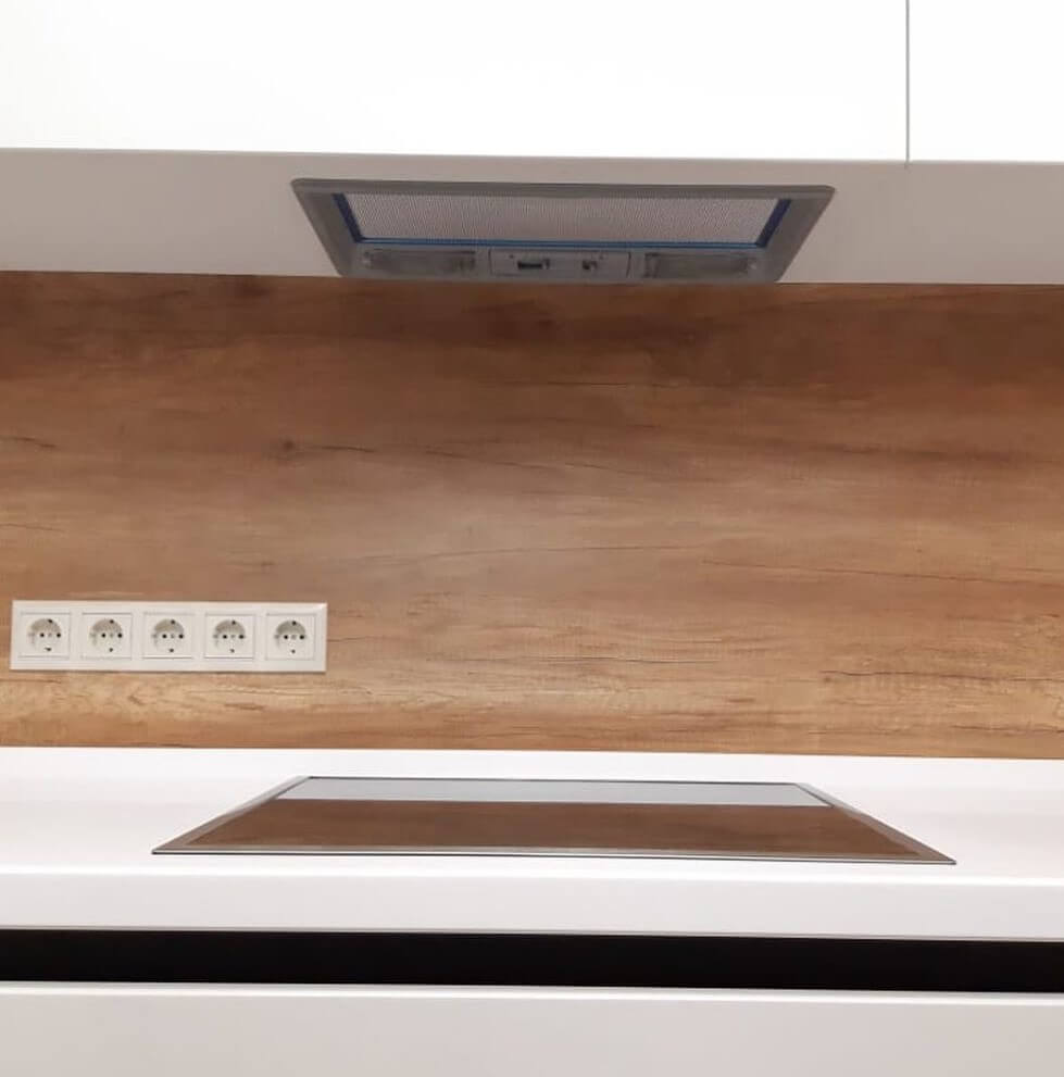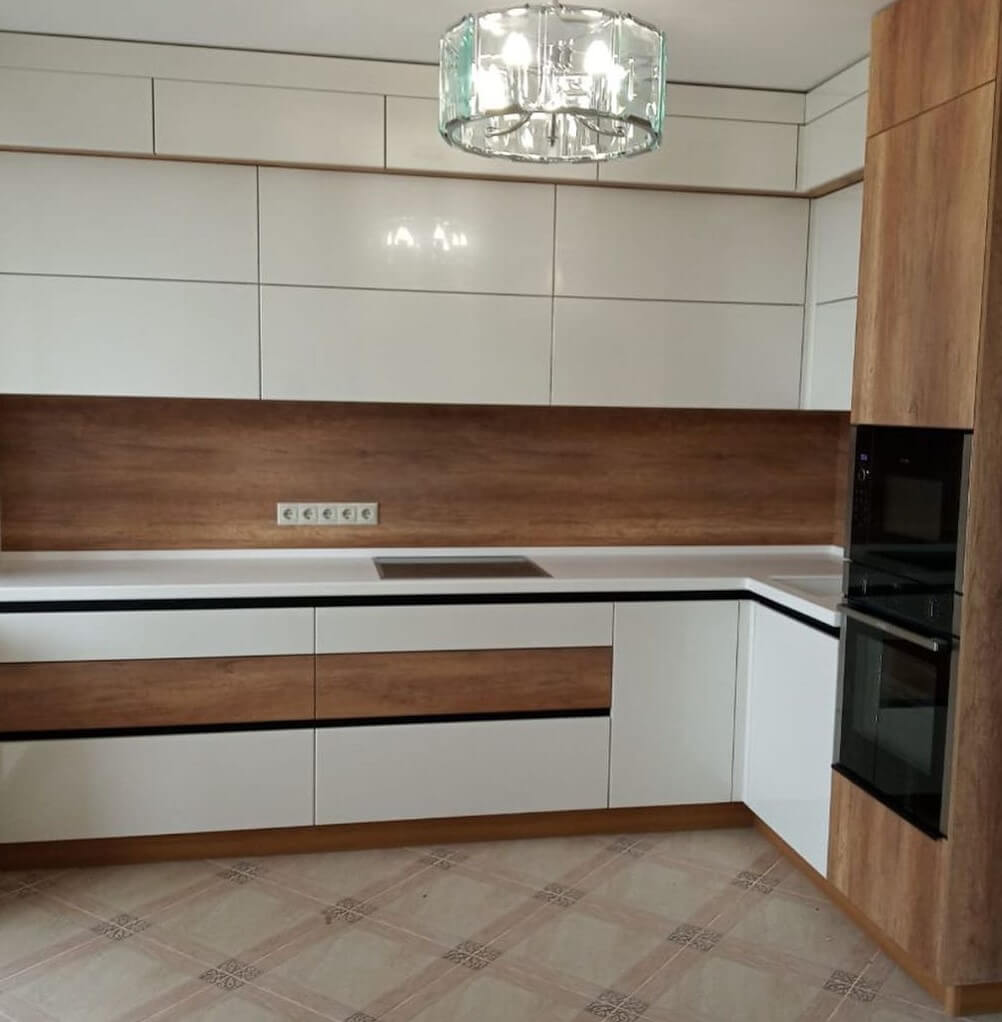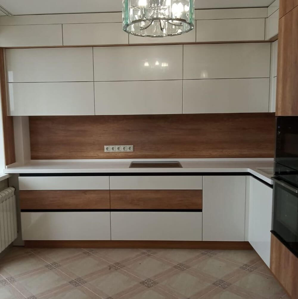 Минималистичная уютная кухня. Гарнитур угловой, 3-метровый, удобно размещается в кухне-столовой. Фасады со скрытыми ручками, белого цвета и глянцевой фактурой, приятно блестят от естественного и искусственного освещения. Фасады и вставки из дерева добавляют гарнитуру уют, а черные линии - отражают характер.