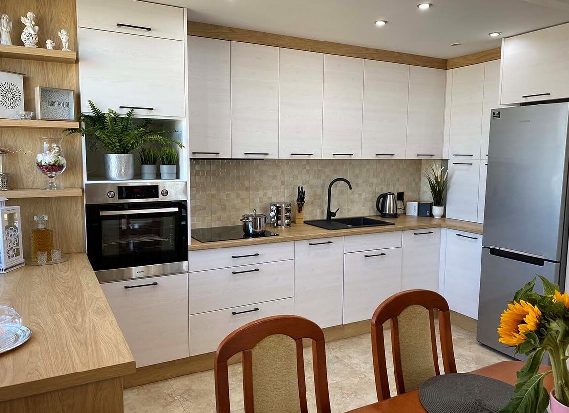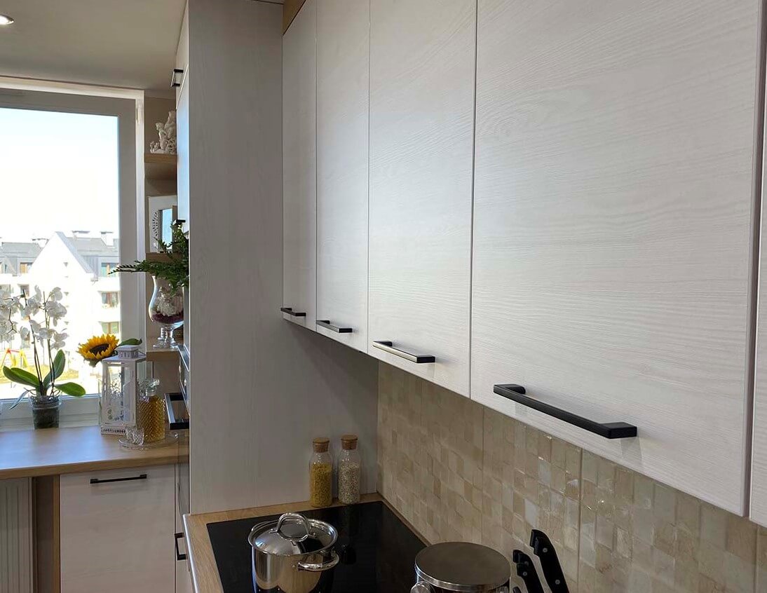 Современная угловая кухня с барной стойкой, расположенной в районе подоконника. Верхние шкафы выполнены под потолок. Гарнитур белого цвета со столешницей из пластика (расцветка под дерево). Органично впишется в интерьер квартиры с небольшой площадью под кухню.