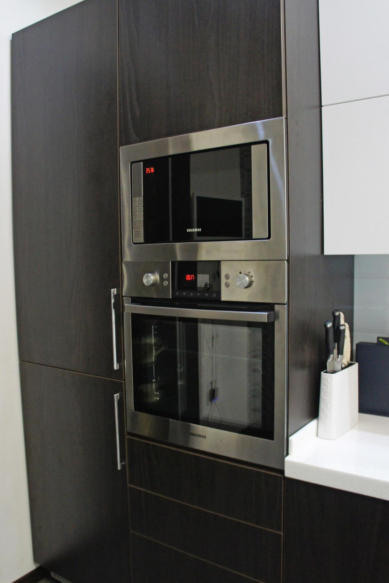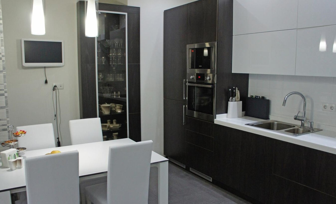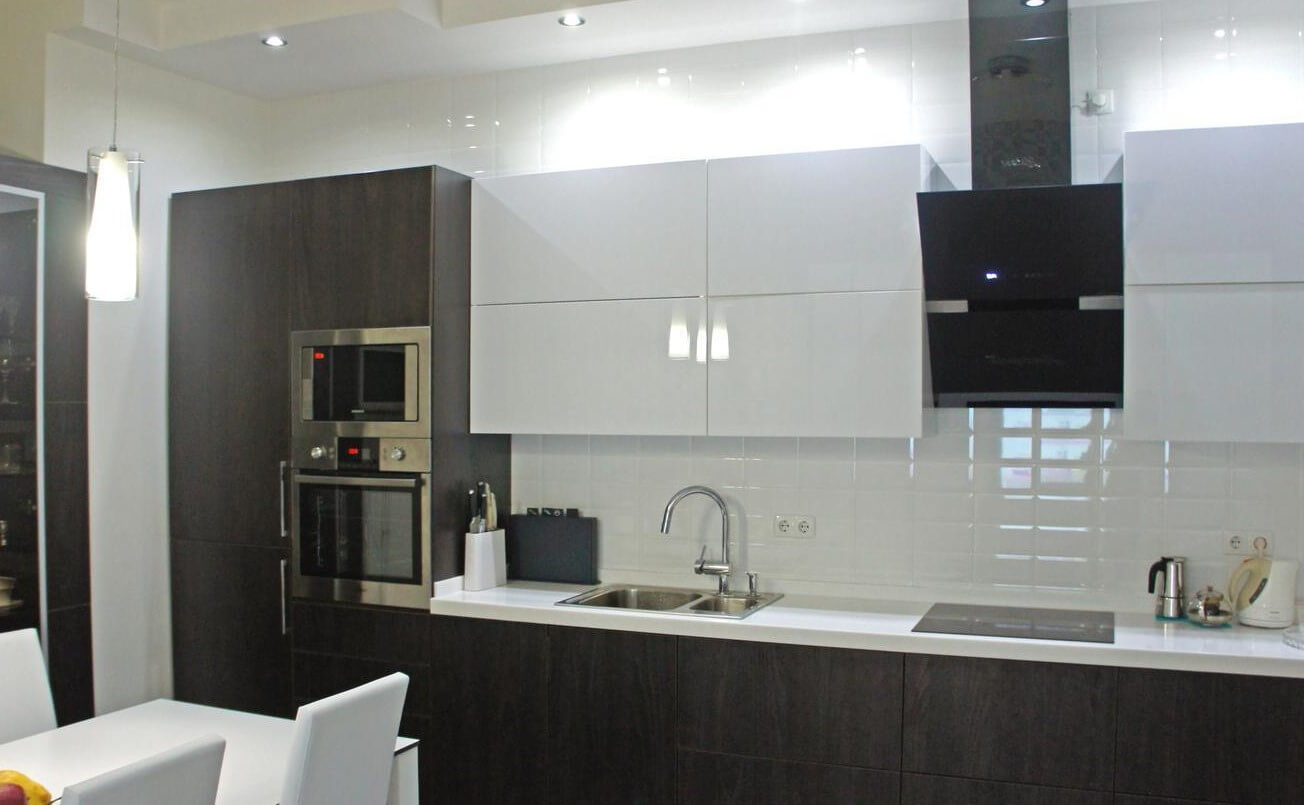 Элегантная кухня в цветовом совершенстве белого и темного. Верх гарнитура выполнен в глянце, нижние шкафы более сдержанные, цвета венге. Кухня прямого расположения. Подойдет для просторной кухни-столовой и интерьера, оформленного в современном стиле.