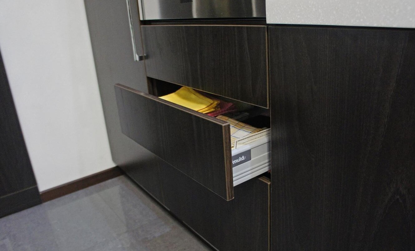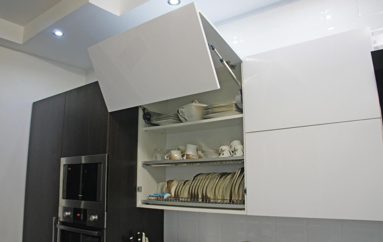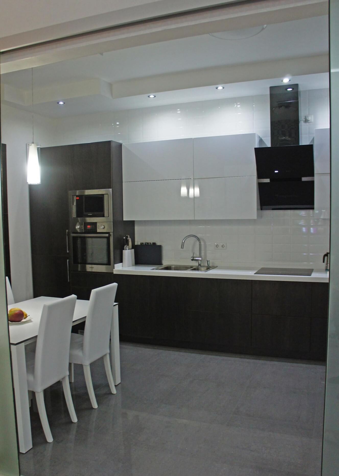 Элегантная кухня в цветовом совершенстве белого и темного. Верх гарнитура выполнен в глянце, нижние шкафы более сдержанные, цвета венге. Кухня прямого расположения. Подойдет для просторной кухни-столовой и интерьера, оформленного в современном стиле.