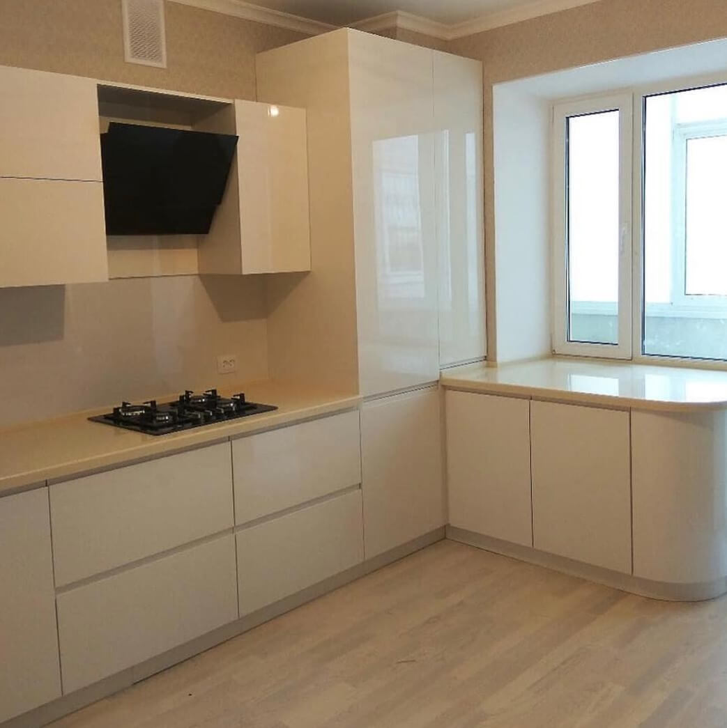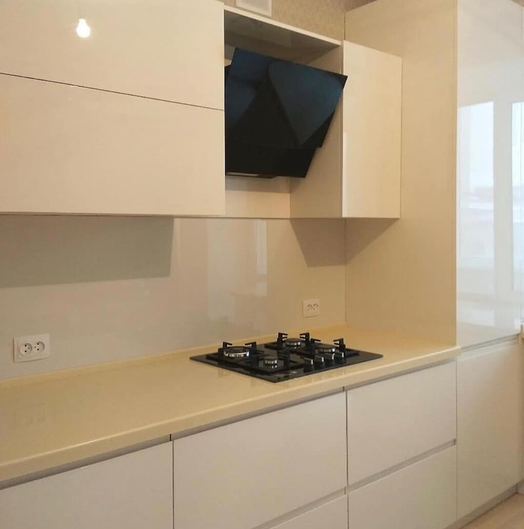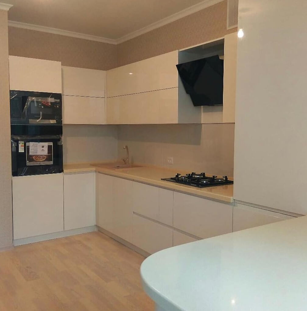 Четкость линий, эстетика и минималистичный дизайн. Кухня, которая сочетает в себе удобство и красоту. Гарнитур цвета шампань с глянцевыми фасадами со скрытыми ручками. Угловое расположение, много шкафов для хранения и встроенный холодильник. Кухня для городской квартиры, обставленной по принципам минимализма.