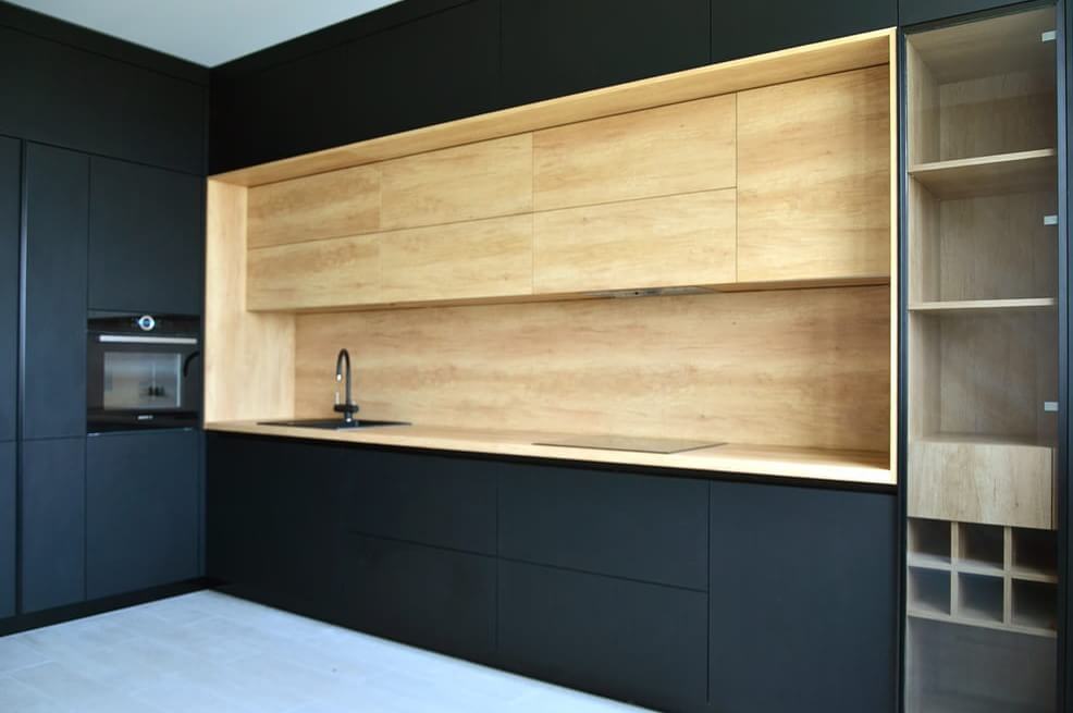 Роскошное сочетание темных фасадов и светлой встроенной рабочей зоны под дерево. Фасады выполнены из экошпона. Гарнитур без лишних деталей, для минималистичного интерьера и просмотренных помещений.