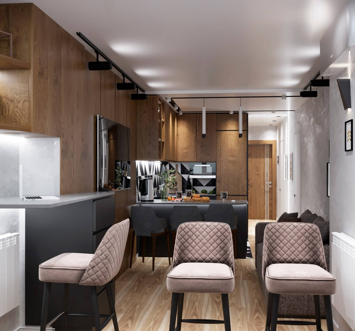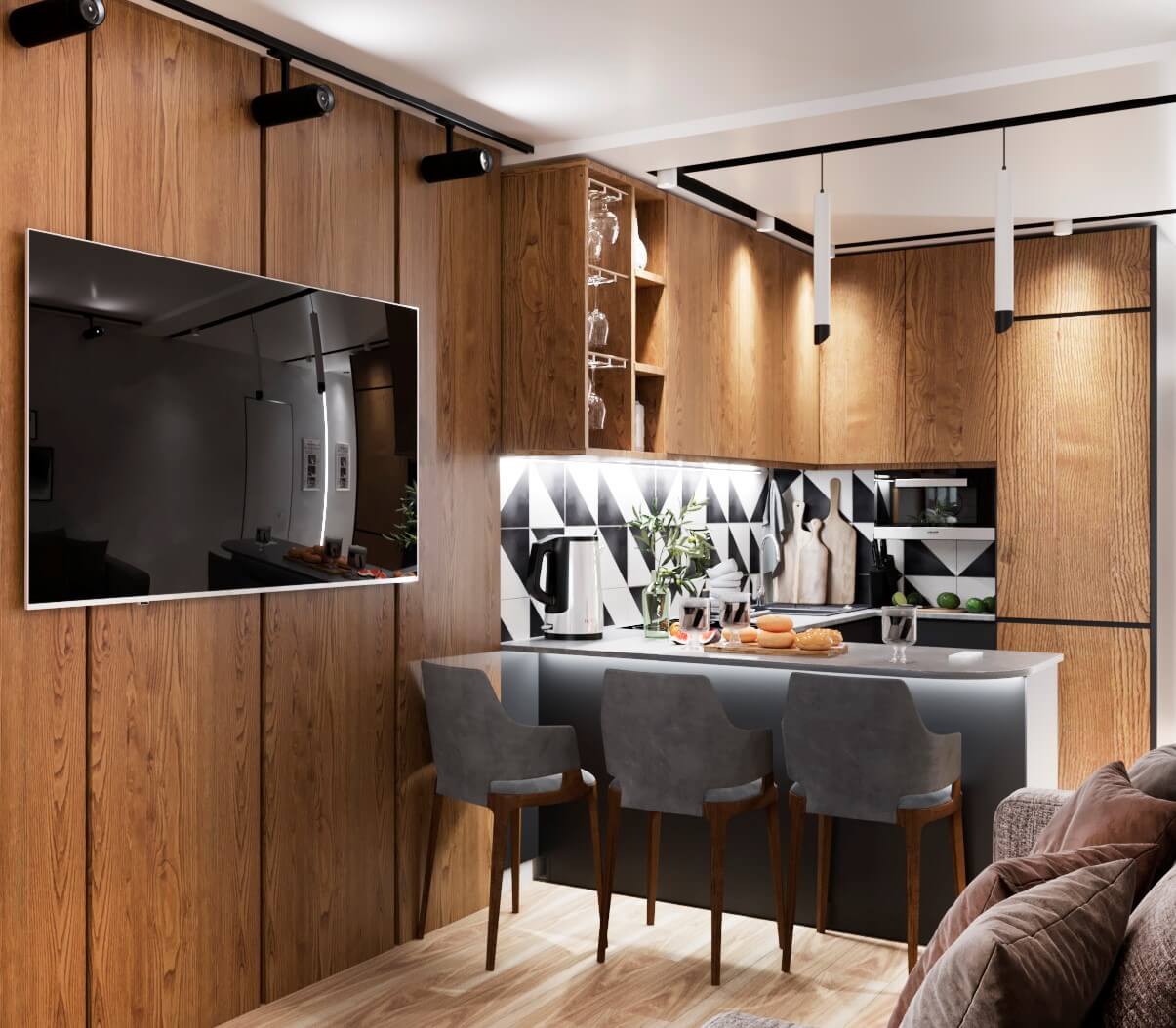 Выразительная кухня с характером под натуральное дерево породы орех. Компактный размер и угловое расположение, фасады под потолок без ручек. Гарнитур идеально впишется в интерьер студии или небольшой холостяцкой квартиры.