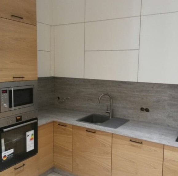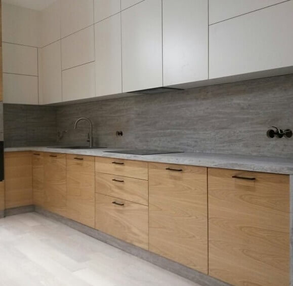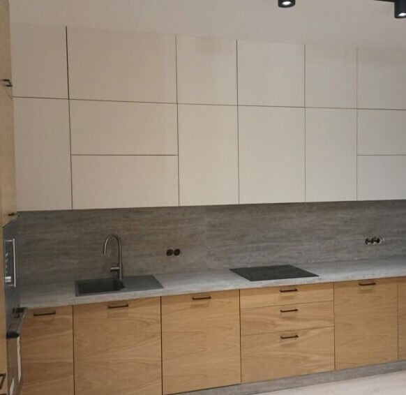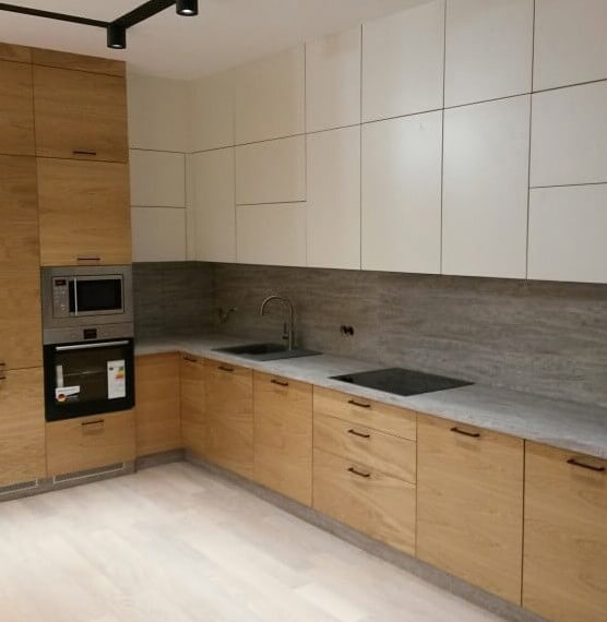 Минималистичная кухня. Дизайн соответствует актуальным тенденциям в интерьерной моде. Верхние шкафы расположены в два ряда и под потолок. Основная часть гарнитура выполнена под дерево с акцентной фурнитурой. Кухня для просторного интерьера - квартиры или частного года.